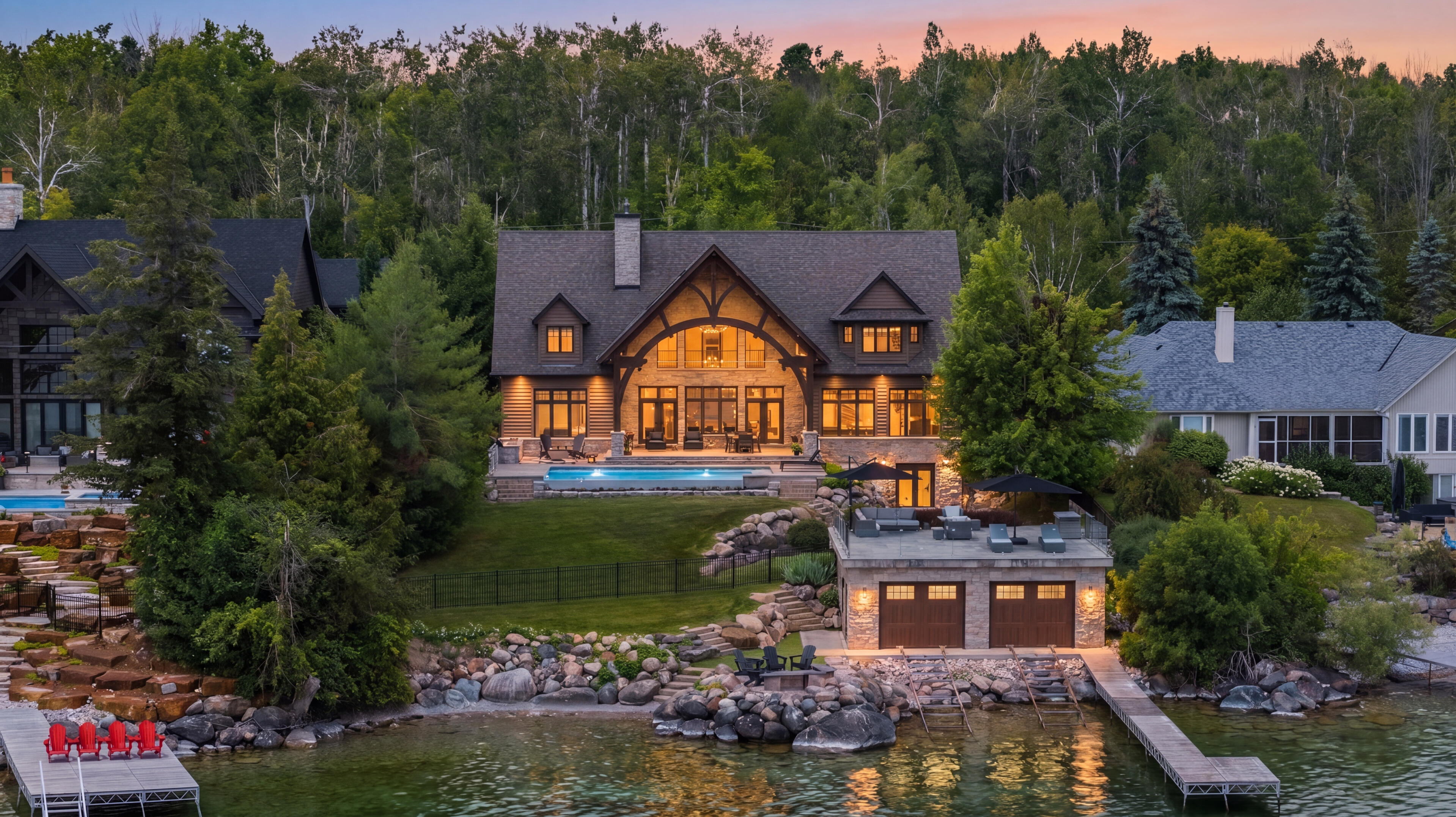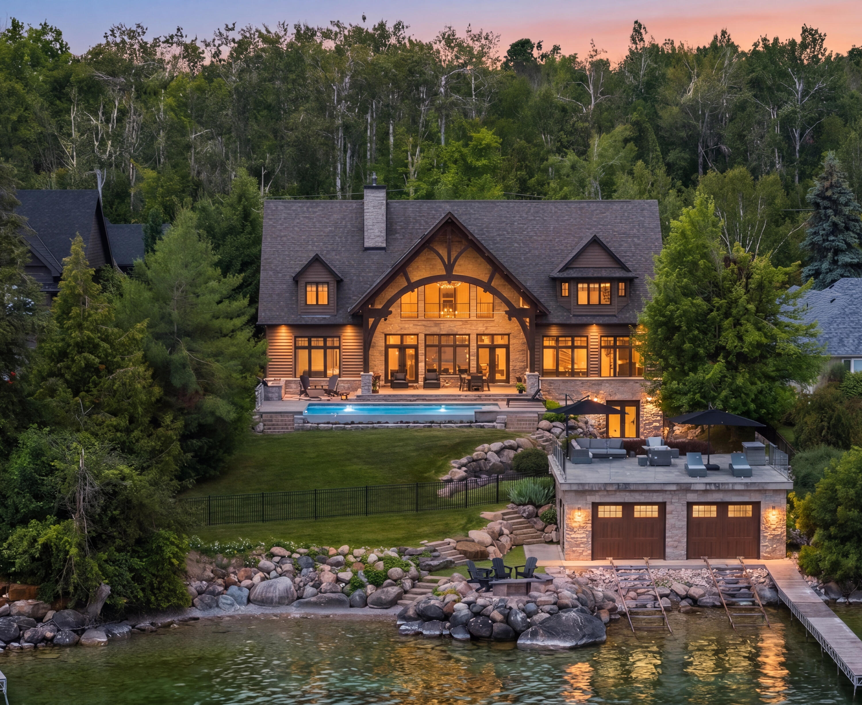 South-facing panoramic views of Lake Simcoe with multiple private lounging areas.Heated infinity pool, expansive patio with BBQ, rooftop boathouse lounge, two fire pits, manicured putting green, and parking for up to 10 vehicles.Designed for entertaining. Or doing absolutely nothing.